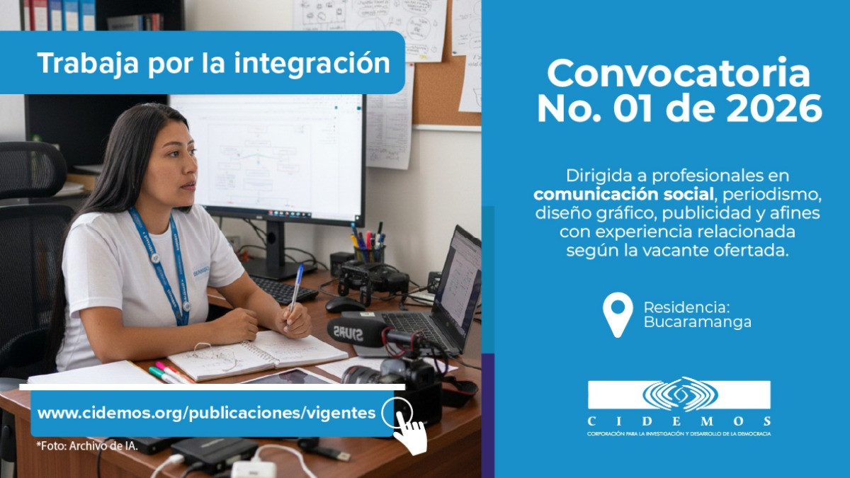 La Corporación para la Investigación y Desarrollo de la Democracia, CIDEMOS, convoca a personas interesadas en ser parte del talento humano para desarrollar las actividades y productos relacionados con las comunicaciones de la organización – Área de Comunicaciones e Innovación.